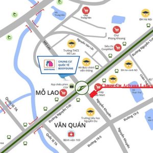 - Cách khu đô thị Mỗ Lao, làng Việt kiều châu Âu, Khu Đô Thị Chung Cư Quốc Tế Booyoung Hàn Quốc 500m